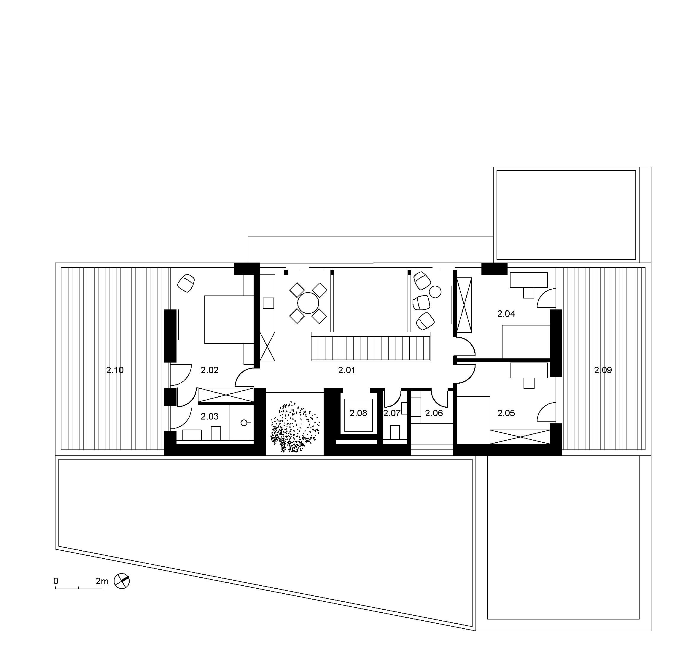 2.01 herňa s kuchynkou 31,2 m² / 2.02 hosťovská spálňa 17,6 m² / 2.03 hosťovská kúpeľňa 5,6 m² / 2.04 detská izba 14,9 m² / 2.05 detská izba 14,4 m² / 2.06 kúpeľňa 4,2 m² / 2.07 wc 2,2 m² / 2.08 výťah / 2.09 terasa 27,7 m² / 2.10 terasa 34,3 m²