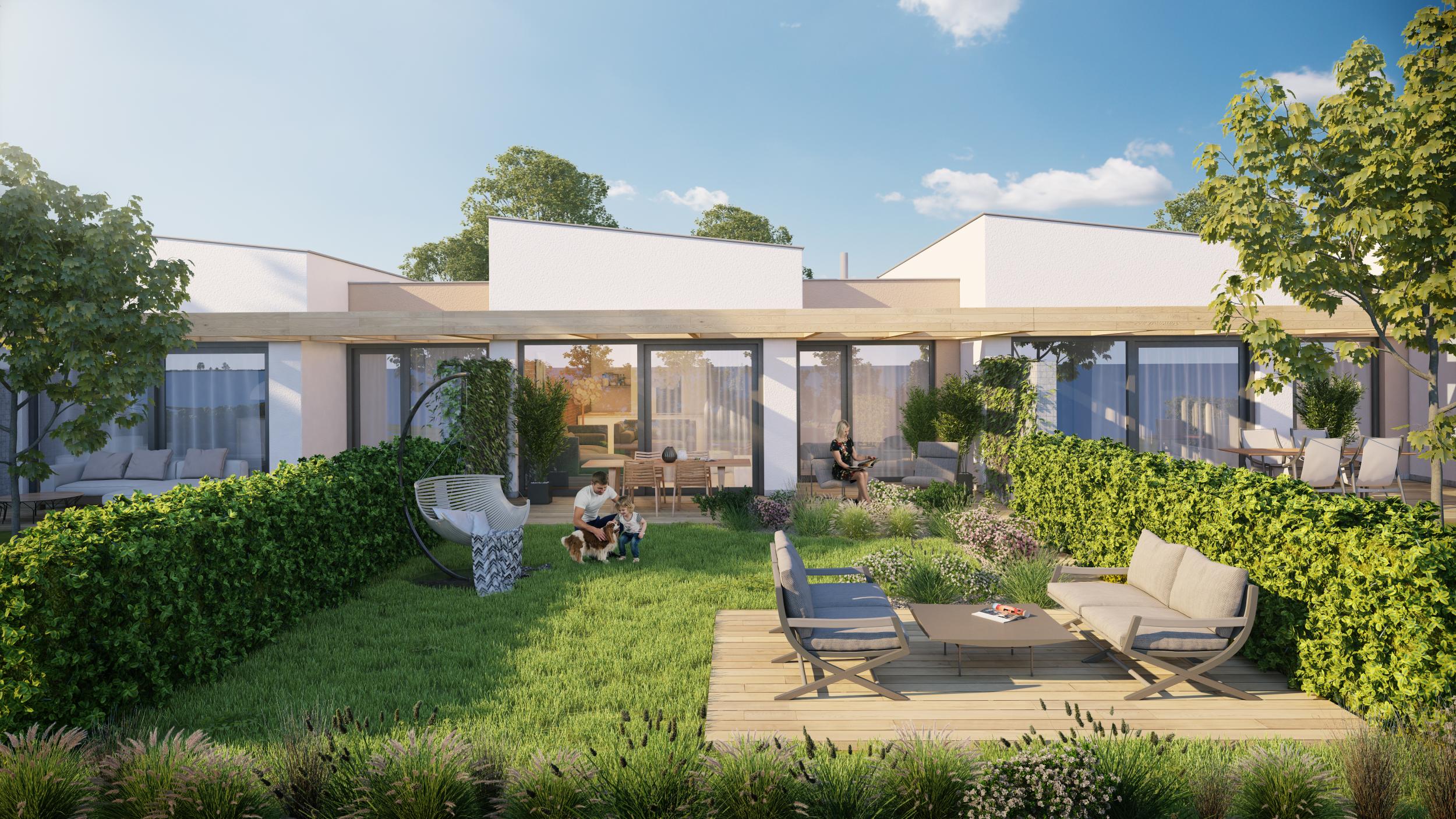 Radové rodinné domy vytvoria zástavbu šestnástich bungalovov v novej štvrti pri Nitre. Na úzkej parcele so šírkou len 7,5 metra sme na jednom poschodí vytvorili funkčný pôdorys s tromi spálňami a komfortnou dennou zónou, ktorý je napriek hĺbke presvetlený a praktický. Veľké okná a svetlovody dávajú domu dostatok denného svetla. Cena domu odpovedá štartovacím domom pre mladých, praktická dispozícia s dostatkom úložných priestorov posúva dom do kategórie domova na celý život.