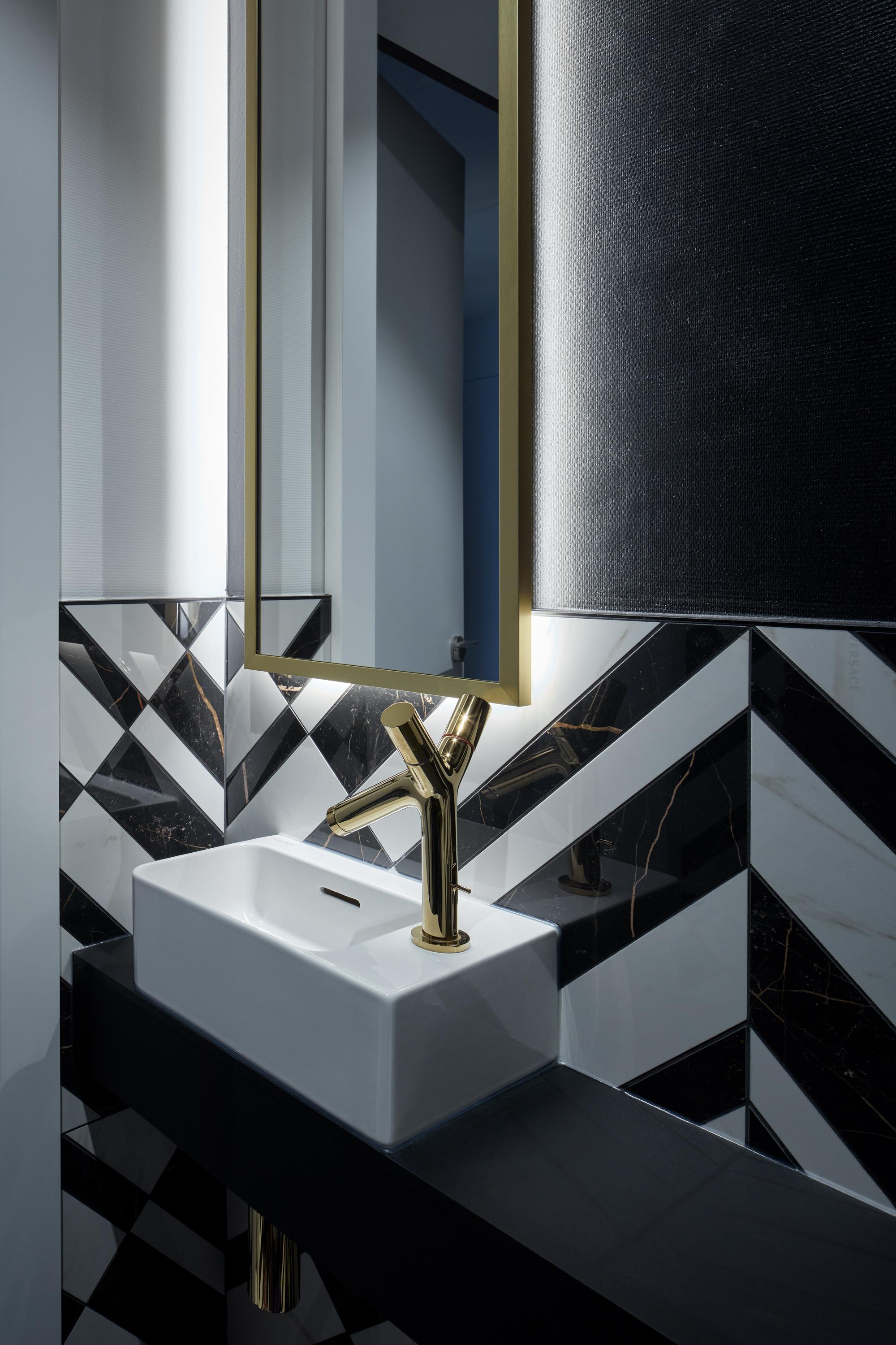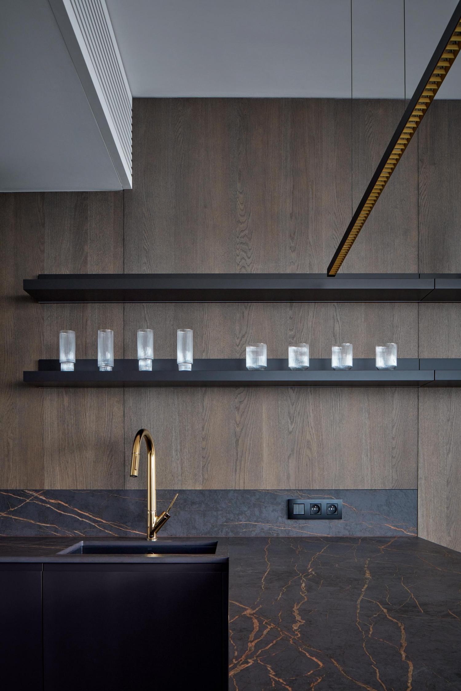 Štýlový trojizbový apartmán v Skypark by Zaha Hadid sme navrhli pre mladého muža s extravagantným vkusom. Nie je určený pre trvalý pobyt rodiny, ale pre príležitostné využitie a potešenie majiteľa. Lesklé podlahy, množstvo zrkadiel, individuálny nábytok z tmavého dreva, zlaté doplnky a zariaďovacie predmety od známych výrobcov tvoria atmosféru štýlového hotela.