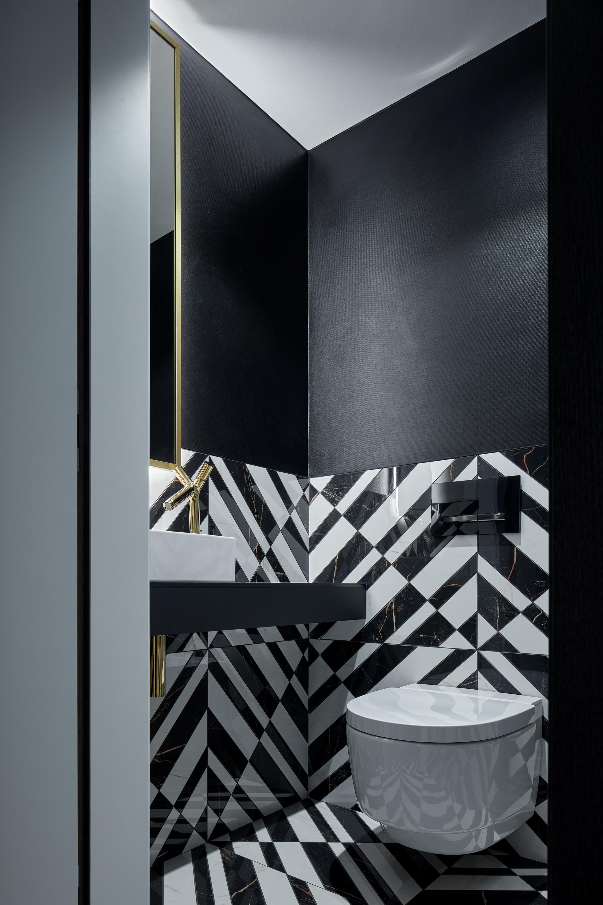 Za neviditeľnými dverami dreveného kubusu sa skrýva malý, ale o to výraznejší priestor so samostatnou toaletou. Čiernobiela dlažba prechádza z chodby na podlahu aj na steny, čím vniesla extravaganciu aj do tejto minimiestnosti. Špeciálna toaleta s integrovaným bidetom má fén aj dámsku spŕšku.