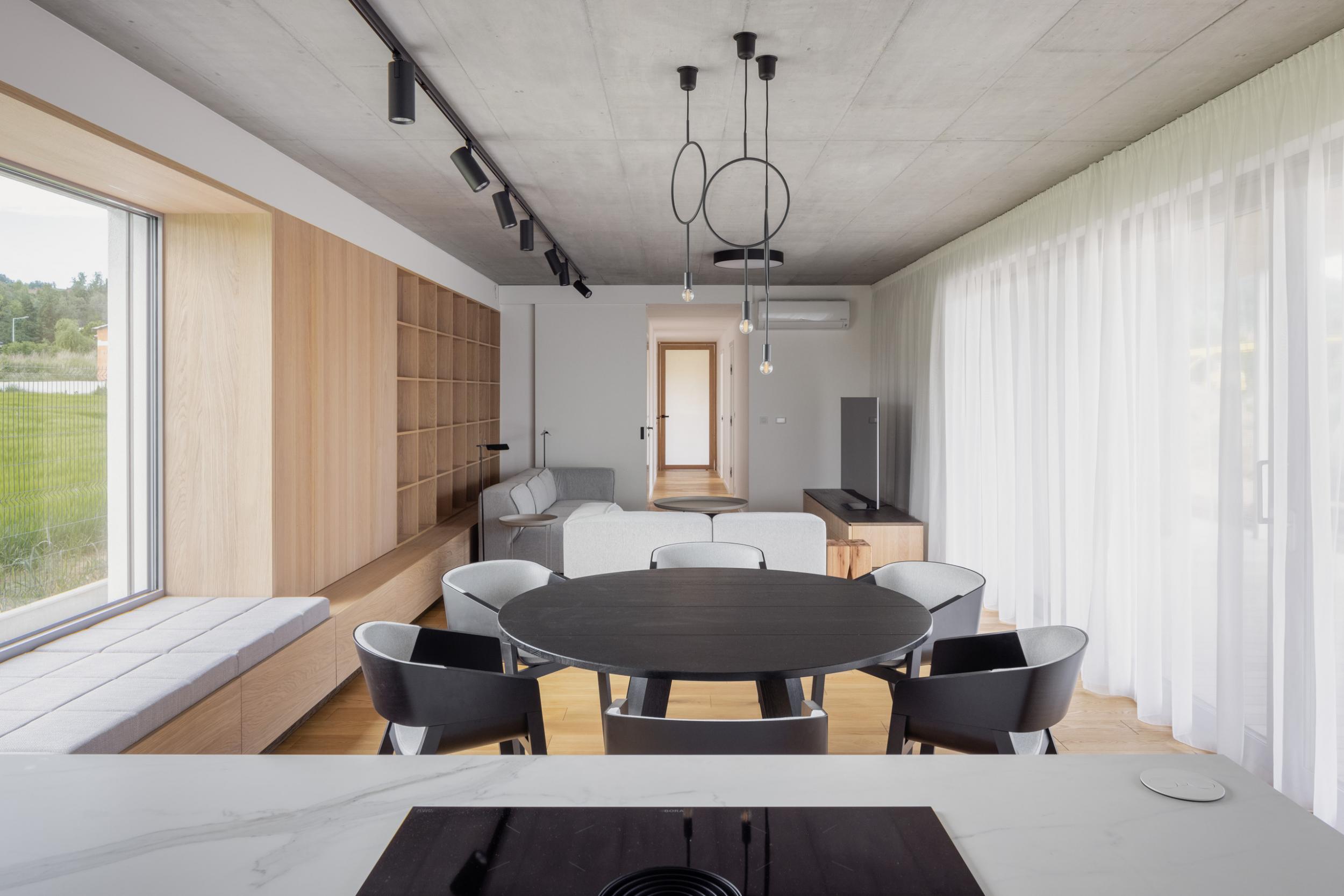 Jedáleň sme umiestnili do stredu dennej zóny na najsvetlejšie miesto s obojstranným presvetlením prirodzeným svetlom. Navrhli sme sem okrúhly jedálenský stôl, ktorý je tvarovo neutrálny a na rozdiel od pravouhlých nevytvára bariéru a priestor nezapĺňa hranami. Vzhľadom na vysokú presvetlenosť jedálenskej časti sme si mohli dovoliť navrhnúť stolovanie v čiernej farbe, čím sa stáva dominantou celého priestoru dennej zóny.