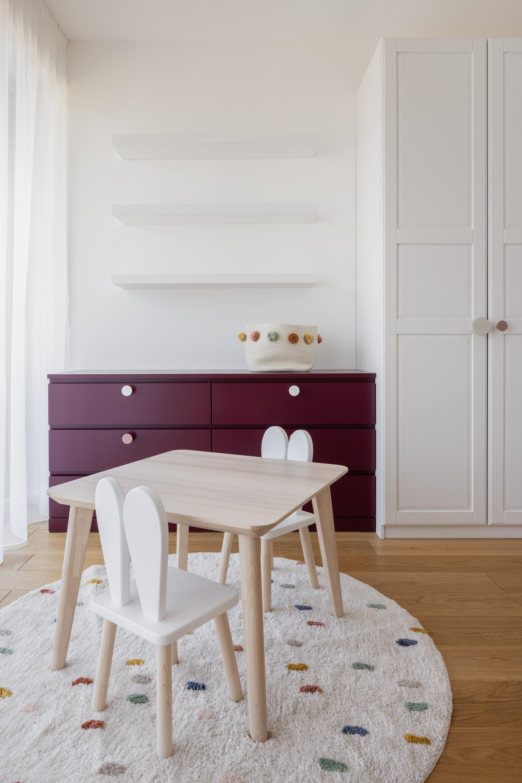 Požiadavkou majiteľov boli flexibilné detské izby bez akéhokoľvek atypického a zabudovaného nábytku, ktorý by v budúcnosti komplikoval ich zmeny. Detskú izbu pre dievčatko sme navrhli z cenovo dostupných typových zariaďovacích predmetov, ktoré splnia účel a po odrastení majiteľky ich bude možno bezproblémov "posunúť ďalej". A izbu aktualizovať a znova vystavať podľa aktuálnych požiadaviek jej obyvateľky.