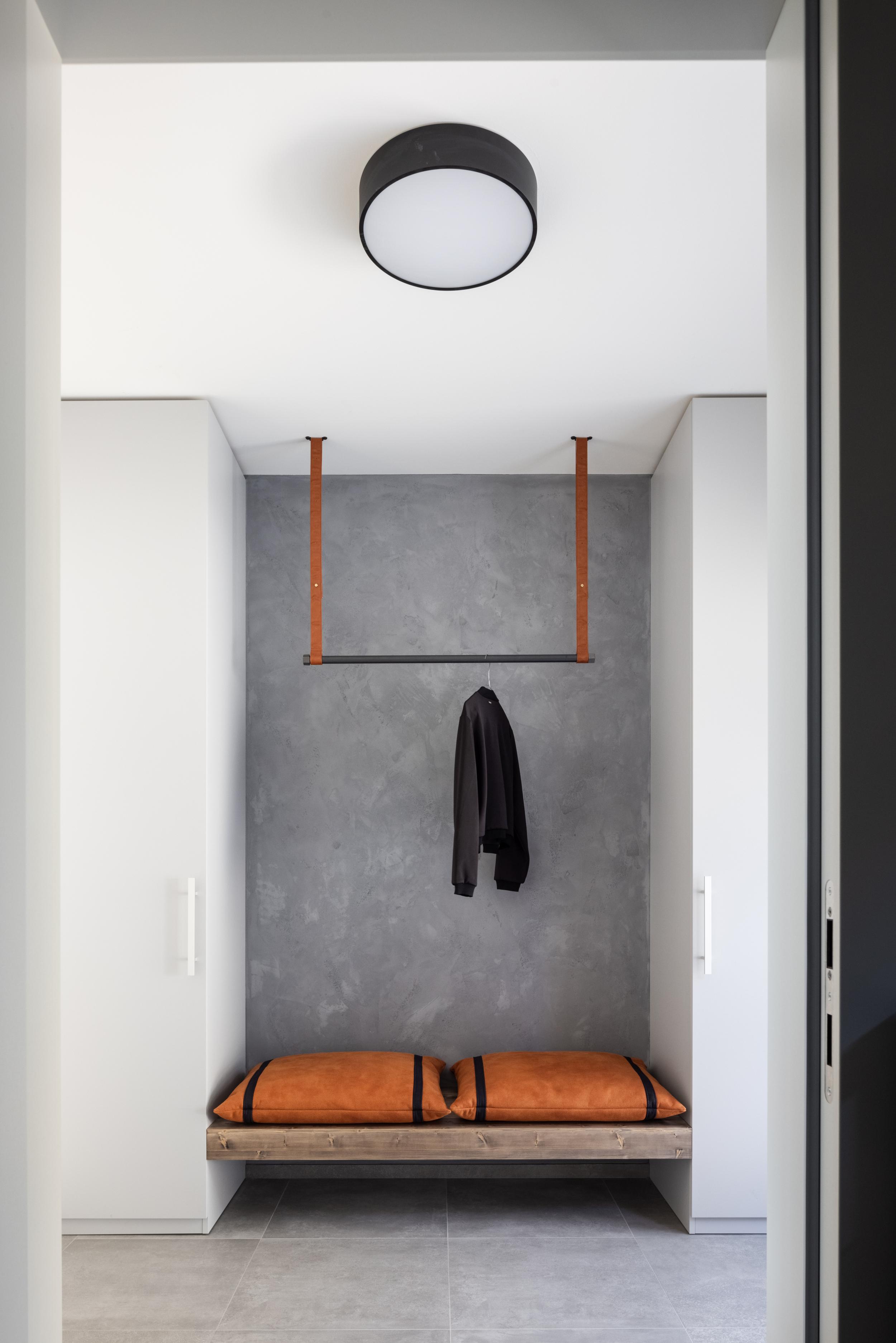 Veľkorysé vstupné podlažie vytvára množstvo priehľadov a prvý je viditeľný už od vstupu. Vstupná zóna pozostáva zo zádveria a prechodného šatníka, z ktorého je prístupná hosťovská toaleta. Monochromatické steny sme oživili doplnkami z hnedej kože, ktoré decentne definujú odtieň priestoru.