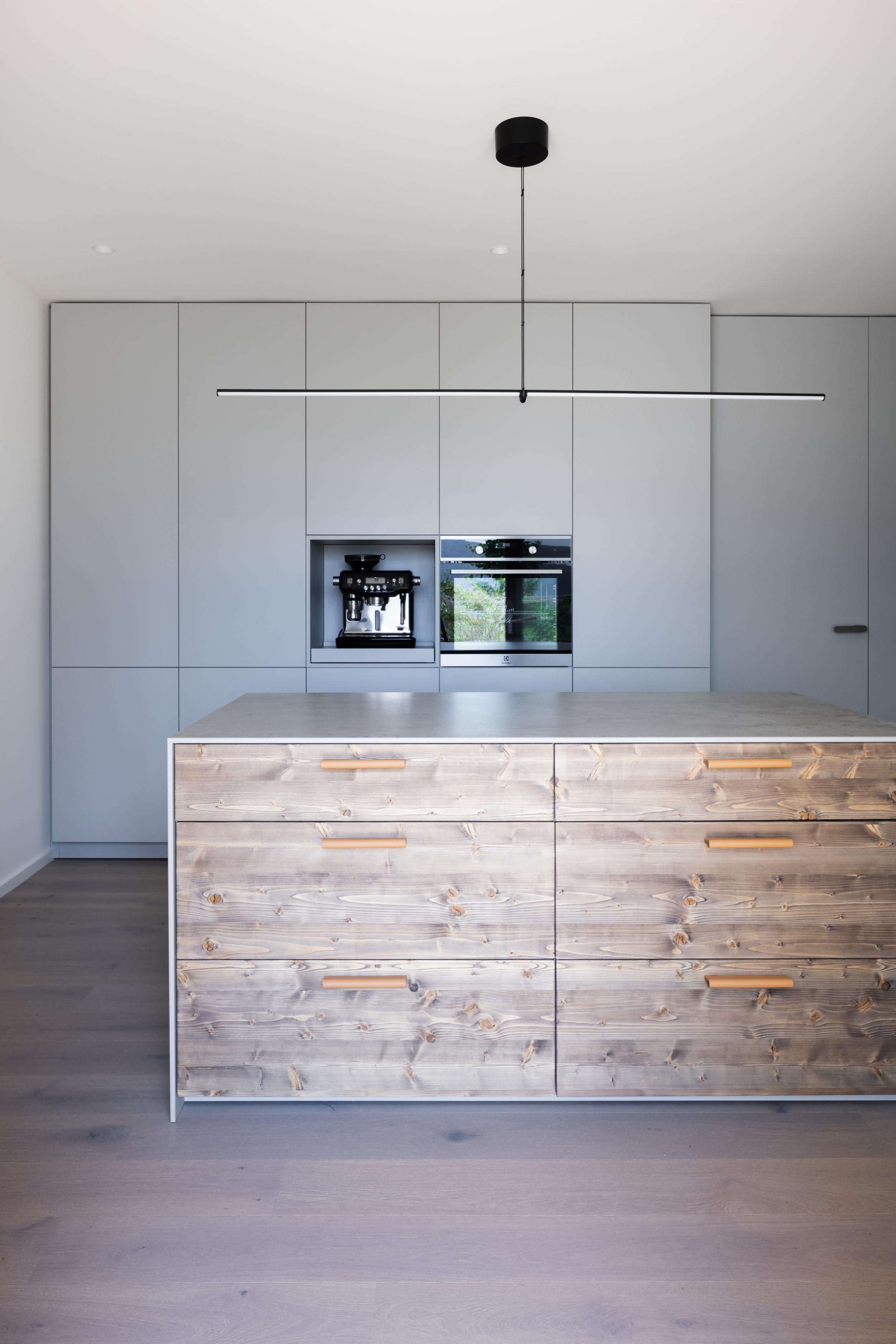 V spodnej časti domu s priamym prístupom do záhrady sa nachádza spoločenská miestnosť. Pre hostí je k dispozícii pohodlné sedenie s kozubom, kompletne vybavená kuchyňa s vinotékou a profesionálny projektor s plátnom. Neutrálny dizajn, veľa dreva a jemné farby korešpondujú so zvyškom domu.