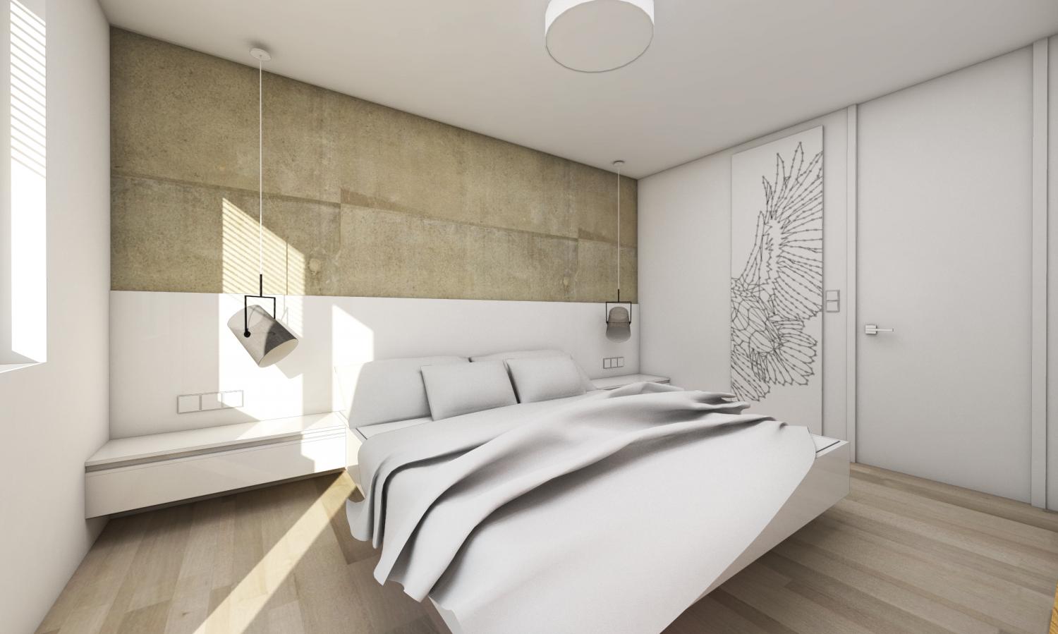 Manželská posteľ hlavnej spálne je z dreva s bielym matným nástrekom. Z rovnakého materiálu je zástena za posteľou aj nočné stolíky, ktoré sú zavesené na zástene. Nočné lampy sme nechali visieť zo stropu. Stena za posteľou má povrchovú úpravu s motívom surového betónu, ktorý sme prifarbili do teplých tónov.