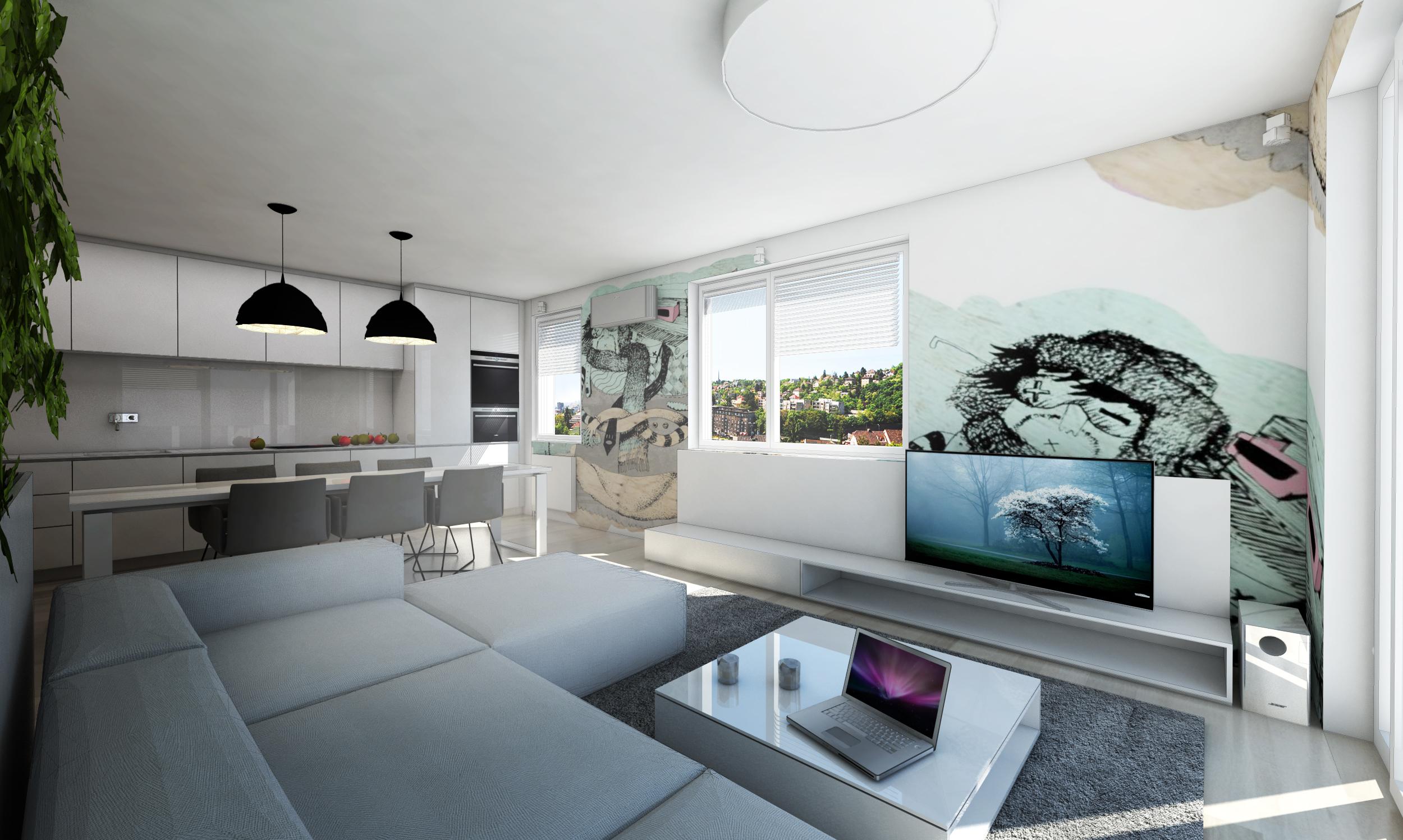 Dominantou dennej zóny je grafika na jednej stene miestnosti, ktorá bola namaľovaná špeciálne pre tento priestor. Ostatné steny sme nechali biele, aby maľba naplno vynikla. Grafika robí priestor jedinečným a zároveň je dostatočne decentná, aby sa majiteľovi rýchlo nezunovala. Autorom maľby je Juraj Hubinský.