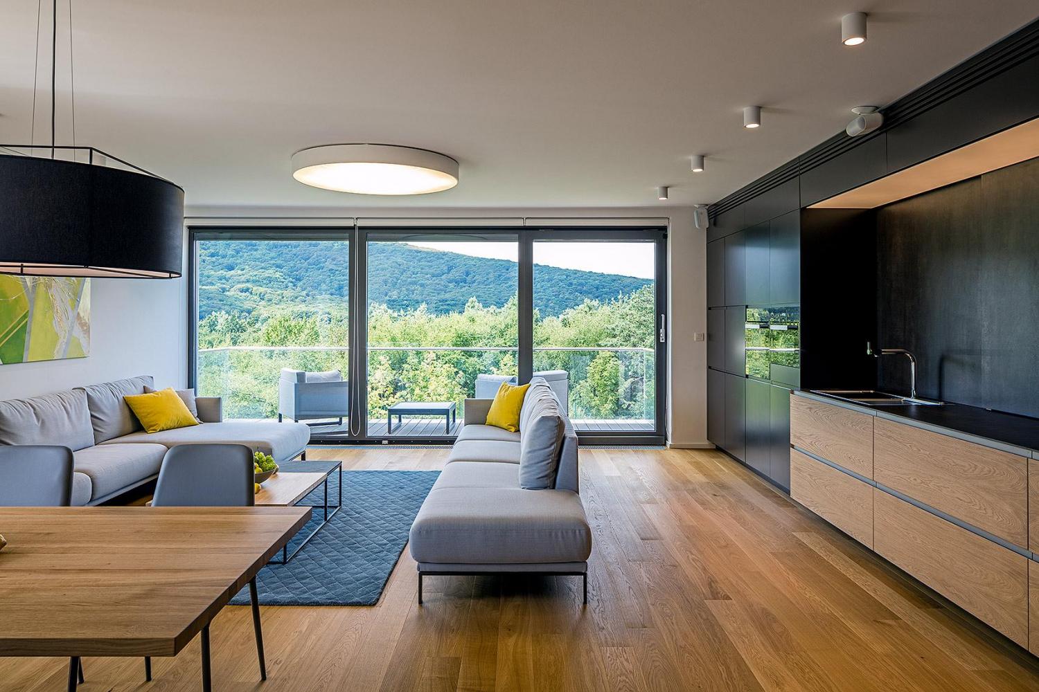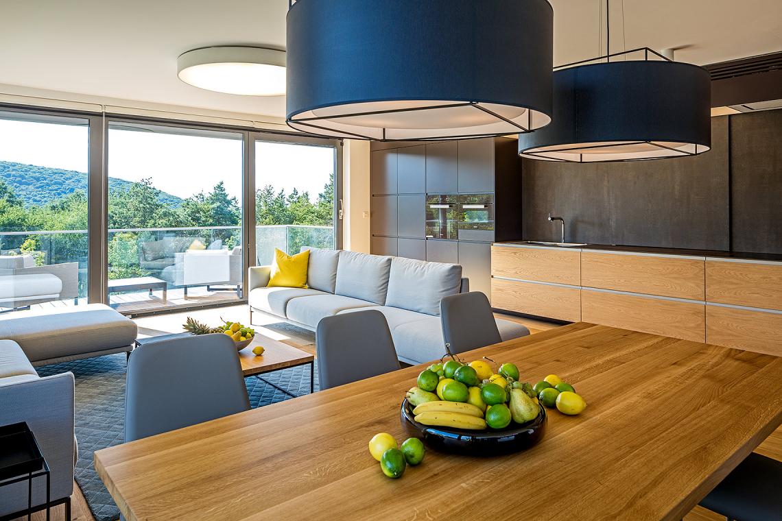 Veľkometrážny byt v rezidenčnom objekte Villa Vista je predovšetkým o výhľade, ku ktorému stačilo dorobiť interiér, ktorý ho nepokazí. Byt je napriek reprezentatívnemu vzhľadu praktický a plní nároky päťčlennej rodiny. V malých spálňach je pre maximálne využitie priestoru väčšina nábytku na mieru. V rozľahlej dennej zóne sme použili typový nábytok od známych výrobcov, ktorý tu má dostatok priestoru, aby vynikol.